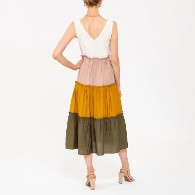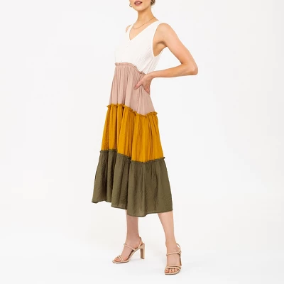 This August Sky colorblock tiered midi dress is perfect for the upcoming season. It features a vneckline front and back. It is line for comfortable wear. It also displays front non-functional buttons and ruffle detailing on each tier.