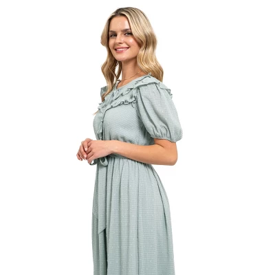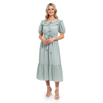 Elevate your wardrobe for the upcoming season and turn heads with this stylish August Sky polka dot textured fabric dress. Made from lightweight fabric for comfortable wear, this short sleeve midi dress it sure to become your go-to piece. Featuring a front tie with ruffle detailing around the neckline and for a more flattering silhouette, it has a tie around the waistline.