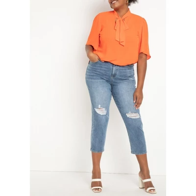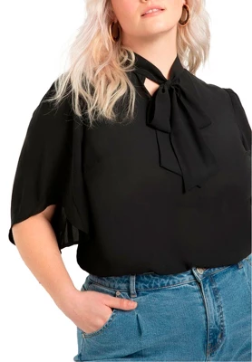 Bow tie blouse with flutter sleeve Easy fit Functional neck ties Hi-low flutter sleeveSide vents Flowy woven double georgette fabric Hits at hip Length on model is 27 1/2″ Models are size 14 and range in height from 5’9″-5’11″100% PolyesterCare: Machine wash on a cold, gentle cycle with like colors. Use only non-chlorine bleach when needed. Tumble dry on low. Cool iron as needed.