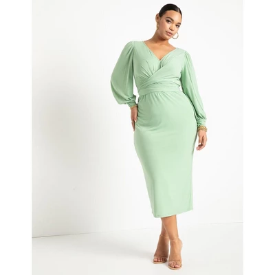 Cross front midi dress Lined skirt Close fit Waist seam Front twist with self ties Column skirt Long sleeve Stretch matte jersey knit Midi length- hits below knee95% Recycled Polyester / 5% SpandexCare: Machine wash cold gentle cycle with like colors. Only non-chlorine bleach when needed. Do not tumble dry. Lay flat to dry. Cool iron as needed.