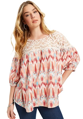 A crochet yoke with scallop detailing adds a delicate touch to this bold top. Statement-making blouson sleeve give your look a dose of volume, cinching at the elbow with an elasticized cuff. Top features a swinging A-line silhouette courtesy of breezy shirring pleats.