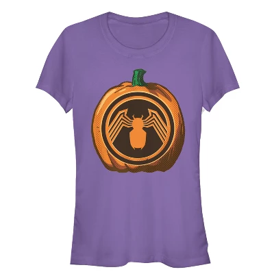 It’s time to go trick-or-treating with your favorite villain and the Marvel Halloween Venom Logo Pumpkin Juniors’ T-Shirt! The Venom spider logo is carved into a pumpkin on this fun Halloween shirt.