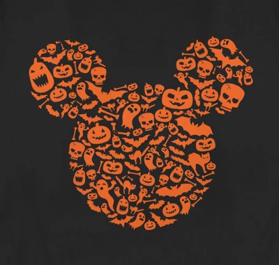 - Strut your stuff with this stylish new women’s t-shirt that is perfect for the spooky season! Featuring the Mickey Mouse silhouette logo across the front, filled with jack-o’-lanterns, ghosts, bats, and skulls.