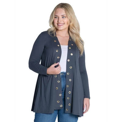 Upgrade your style game with our Long Sleeve Mid Thigh Open Front Plus Size Cardigan with Grommet Details. Effortlessly chic and versatile, this cardigan is a must have addition to your wardrobe. Crafted with attention to detail, the gold grommet details along the lapel add a touch of sophistication and modernity to any outfit. Its flattering mid thigh length and open front design make it the perfect layering piece for any occasion. Available in three stylish color options, this cardigan allows you to express your unique fashion sense. Whether you are dressing up for a night out or adding a layer of warmth to your everyday ensemble, this cardigan is the perfect blend of comfort and style. Embrace fashion forward elegance and make a statement with our Long Sleeve Mid Thigh Open Front Cardigan with Grommet Detail.